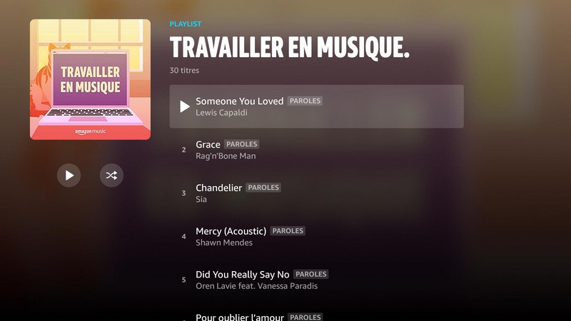 Lors de l’ouverture d’une liste de lecture, l’interface propose une lecture des morceaux dans l’ordre ou une lecture aléatoire des titres