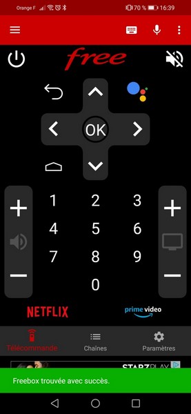L’application “Télécommande Freebox” nécessite pour rappel que l’appareil soit connecté au réseau Wi-Fi de la Freebox. Côté fonctionnalités, on a des boutons pour afficher le clavier virtuel, la commande vocale, la manette virtuelle et le guide des chaînes. On a également le retour haptique. Elle peut se montrer pratique lorsque l’on ne trouve plus sa télécommande ou lorsque l’on se retrouve à court de piles en plein week-end.