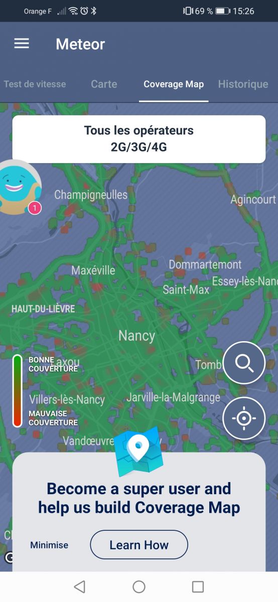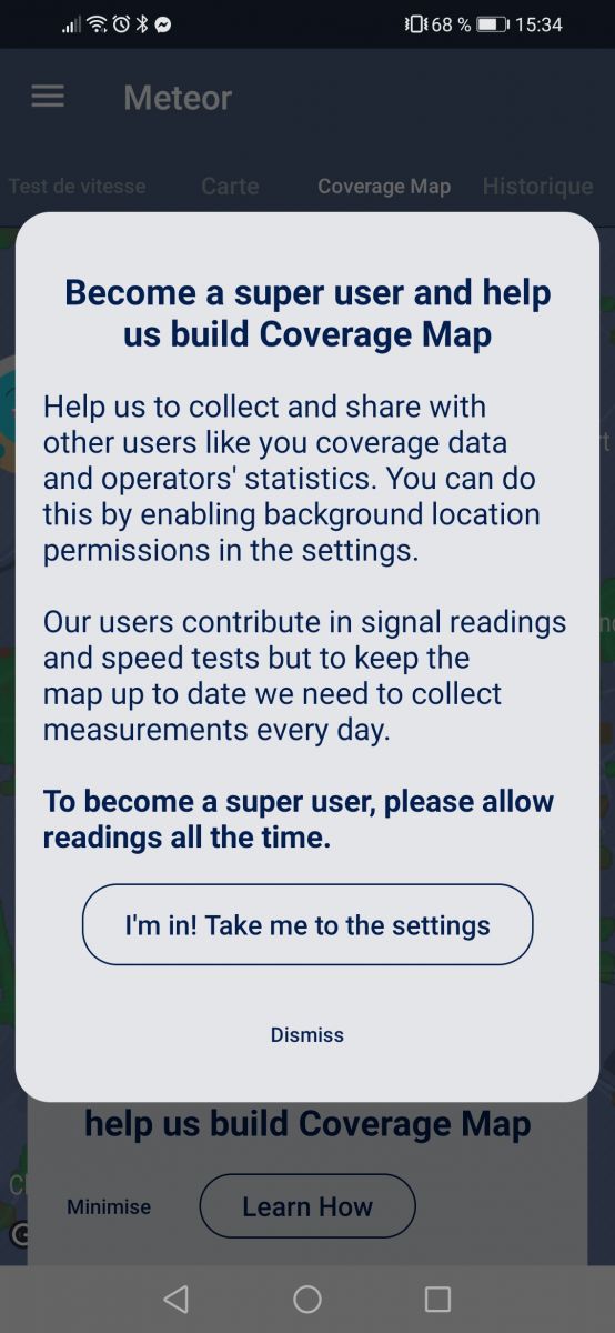 Il vous est bien sûr proposé de participer pour étoffer cette carte, en collectant et partageant vos données de couvertures et les statistiques de vos opérateurs. Vous êtes alors guidés pour permettre la collecte de données de localisation dans les paramètres de votre smartphone. Vous deviendrez ainsi un “Super utilisateur”.