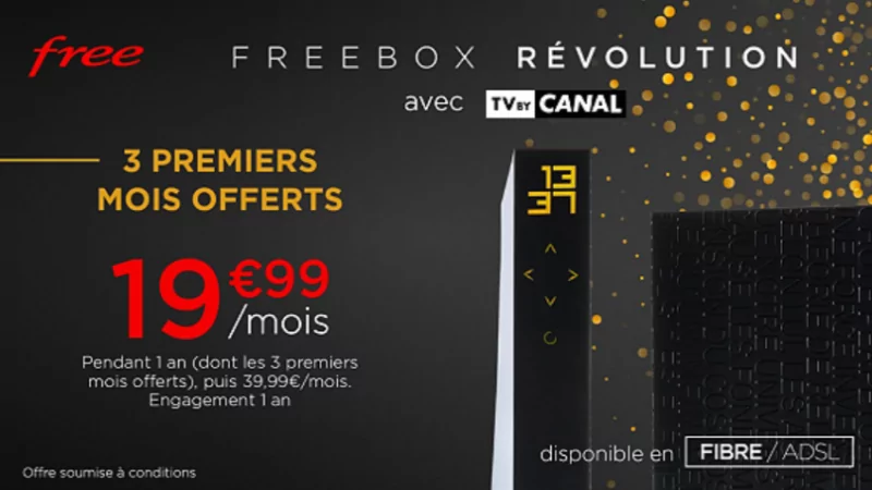 Offre promotionnelle soumise à conditions, avec engagement de 12 mois, valable pour toute souscription au Forfait Freebox Révolution avec TV by CANAL avec offre promotionnelle Veepee , sous réserve d’éligibilité, hors prestations tarifées à l’acte ou optionnelles, hors cas de construction de ligne, réservée aux membres de Veepee.fr :