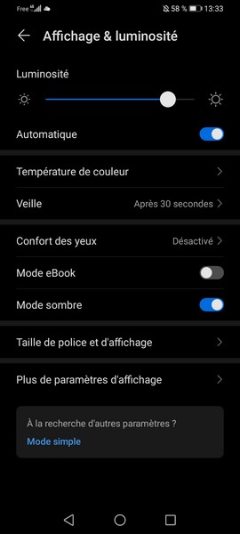 Côté écran, on a le minimum syndical : dalle IPS, définition HD+ et encoche goutte d’eau pour le capteur photo. À l’usage, l’écran du Huawei Y6p n’a jamais posé de problème en termes d’angles de vision et de luminosité. Il fait tout simplement le boulot. Notez qu’on peut régler la chaleur d’affichage dans les paramètres.