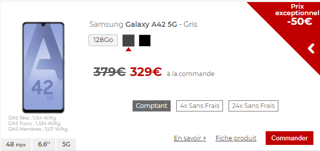 Le Samsung Galaxy A42 5G voit son prix passer de 379€ à 329€ euros, grâce à une remise de 50€ euros. On peut aussi le payer en 4x sans frais : 83 euros à la commande, puis 3 fois 82 euros, mais également en 24 mensualités : 137€ à la commande puis 8€ durant 24 mois.