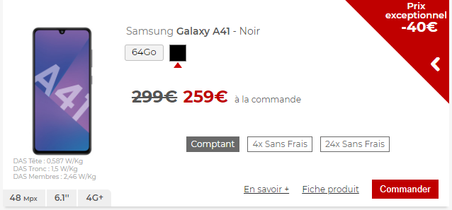 Le Samsung Galaxy A41 voit son prix passer de 299€ à 259€ euros, grâce à une remise de 40€ euros. On peut aussi le payer en 4x sans frais : 67euros à la commande, puis 3 fois 64 euros, mais également en 24 mensualités : 67€ à la commande puis 8€ durant 24 mois.