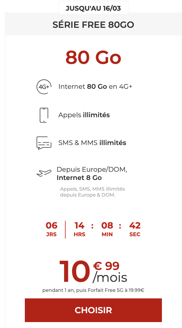 L’opérateur propose pendant une semaine une offre Série Free avec 80 Go de data en France métropolitaine et 8 Go en roaming, au prix de 10,99€ pendant 1an.