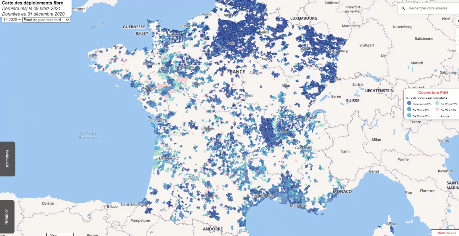 La carte de l’Arcep de suivi de l’avancement des déploiements fibre vient d’être mise à jour, avec les données du 4ème trimestre 2020 pour les couches immeubles.