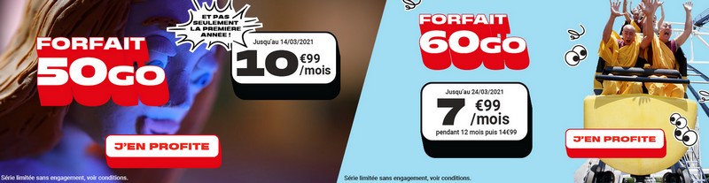 Deux séries limitées chez NRJ Mobile avec 50 ou 60 Go pour l’Internet mobile. Dans le premier cas, le tarif promotionnel est promis au-delà de la première année. Dans le second, il vaut pour les 12 premiers mois.