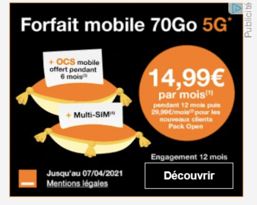 Dans le même temps, Orange pense aussi à la convergence en proposant aux clients Pack Open ( Livebox+mobile), son forfait 70 Go 5G avec OCS mobile offert pendant 6 mois et le multi-SIM, au prix de 14,99€/mois la première année puis 29,99€/mois. L’offre est disponible jusqu’au 7 avril.