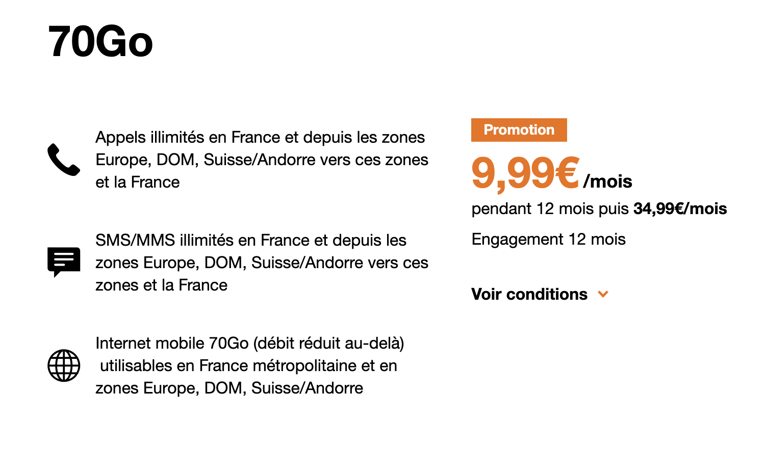C’est suffisamment rare pour le noter, Orange entre dans la bataille des prix sur le mobile. Jusqu’au 29 avril, l’opérateur historique brade son forfait 70 Go avec un engagement d’un an. Son prix, 9,99€/mois pendant un an. Bémol, au bout des 12 mois, il faudra débourser 34,99€/mois ou résilier et partir à la concurrence.