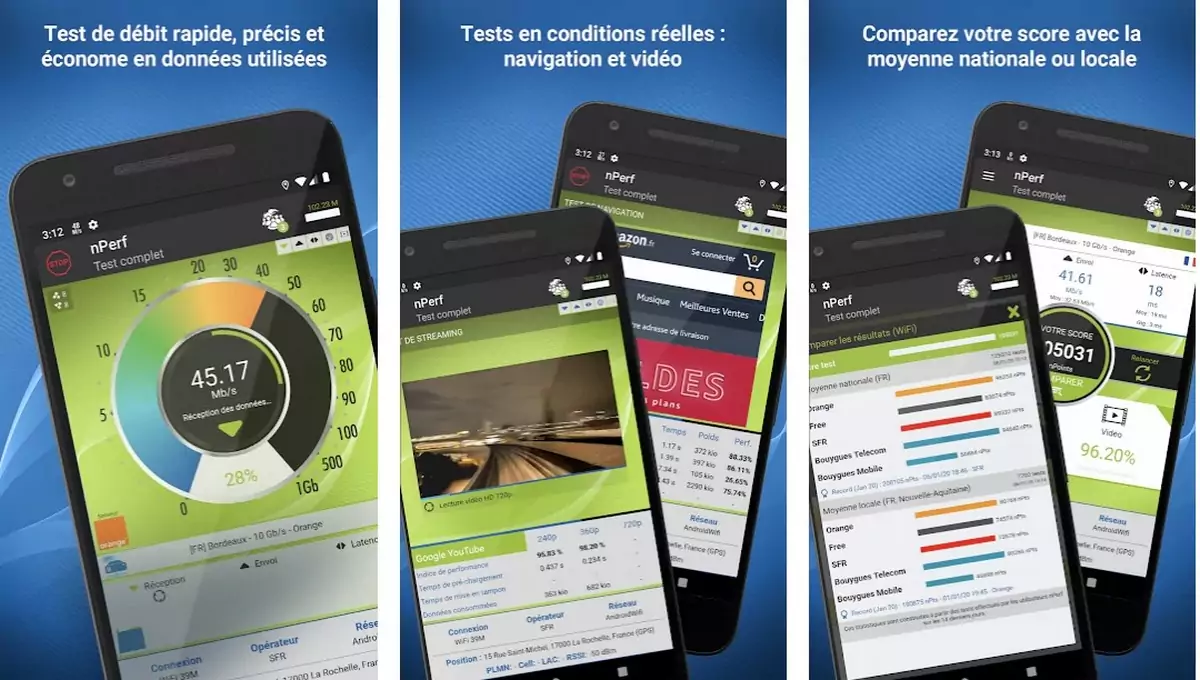 Disponible gratuitement sur Android et iOS, l’application mobile nPerf permet pour rappel d’évaluer la qualité de sa connexion 3G, 4G, 5G et Wi-Fi, en effectuant un test de débit descendant et montant, mais aussi un test de navigation sur plusieurs sites Internet et de streaming vidéo avec différentes qualités d’affichage. Un nombre de points est par la suite révélé lequel reflète la qualité globale de la connexion. Une carte de couverture et débits est également disponible avec un filtrage par opérateur (Orange, Free Mobile sans itinérance, SFR et Bouygues Telecom).