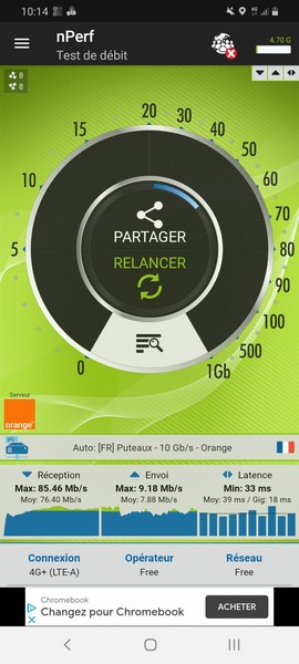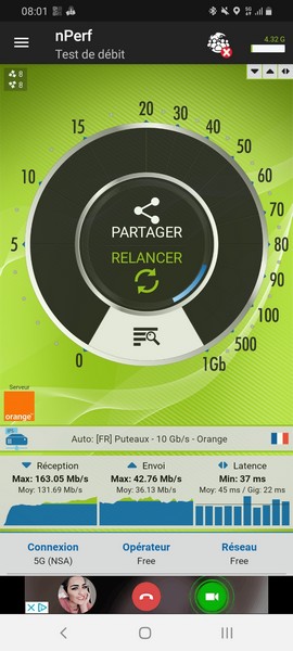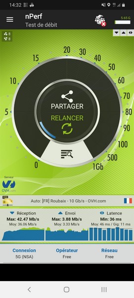 Comme son nom l’indique, le Galaxy A42 5G supporte la 5G. Le logo est d’ailleurs apparu après l’installation d’une mise à jour durant notre test, celle apportant au passage les patchs de décembre 2020. Le smartphone s’annonce aussi compatible avec la 4G 700 MHz (B28) chère aux abonnés Free Mobile. On a bien une possibilité de fonctionnement dual-SIM, mais avec un emplacement hybride Nano-SIM / MicroSD, obligeant ainsi à sacrifier l’extension de la mémoire interne.