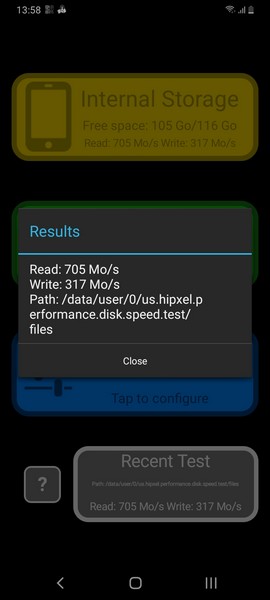 Pour les amateurs de benchmark, l’outil Disk Speed indiquait 317 Mo/s en écriture et 705 Mo/s en lecture. Pas mal.