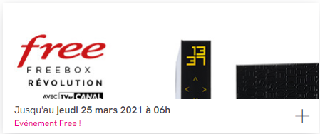 La semaine dernière, Free lançait une nouvelle offre sur Veepee qui devait prendre fin ce mardi à 6h. L’opérateur vient de la prolongée pour plus d’une semaine, soit jusqu’au jeudi 25 mars à 6h00. Cette offre spéciale Freebox Révolution avec TV by Canal est proposé à 19,99€/mois la première année mais avec les 3 premiers mois offerts. Les frais de résiliation de votre ancien opérateur sont inclus
