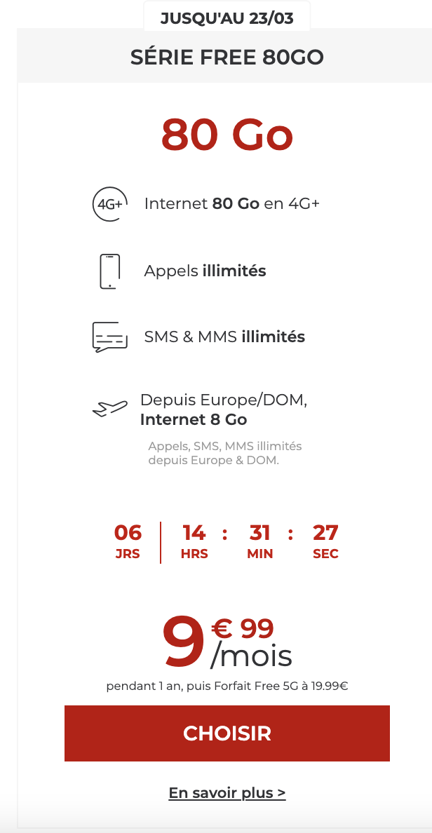 Pas une semaine sans que Free Mobile change sa formule. Lassante pour certains, cette stratégie laisse parfois l’opportunité de tomber sur une offre attractive. c’est le cas aujourd’hui, l’opérateur lance jusqu’au 23 mars une Série Free avec 80 Go de data en France métropolitaine et 8 Go depuis l’étranger à 9,99€/mois pendant 1 an, soit 1 euro de moins que la semaine dernière.