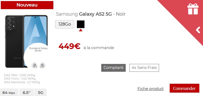 Le smartphone en question, c’est le Galaxy A52 5G fraîchement annoncé par le constructeur sud-coréen, aux côtés des Galaxy A52 et Galaxy A72 limités à la 4G. Ce modèle est proposé à l’achat au comptant à 449 euros ou en 4 fois sans frais (113 euros à la commande, puis 3 x 112 euros). Des écouteurs sans-fil Galaxy Buds+, d’une valeur de 129 euros, sont par ailleurs offerts.