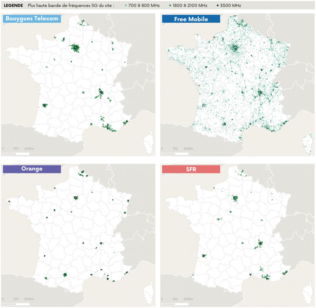 Bouygues Telecom, Orange et SFR s’appuient sur la bande 2,1 GHz, et Free Mobile se distingue par l’usage de la bande 700 MHz. Les bandes basses apportent une meilleure couverture surfacique et à l’intérieur des bâtiments, mais des débits non comparables à ceux fournis par les bandes hautes comme la 3,5 GHz.