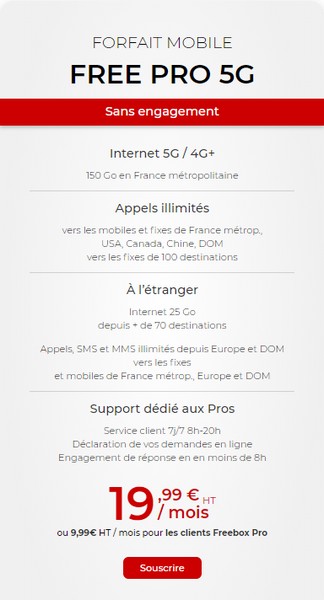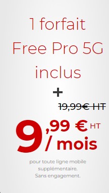 Elle se compose d’une offre fixe détaillée dans un autre article et une offre mobile que nous allons détailler dans celui-ci. Sans engagement et répondant au nom de Free Pro 5G, le forfait mobile en question coûte 19,99 euros HT par mois. Pour les abonnés à l’offre fixe Freebox Pro, une première ligne mobile est offerte. Les suivantes coûtent 9,99 euros HT par mois chacune.