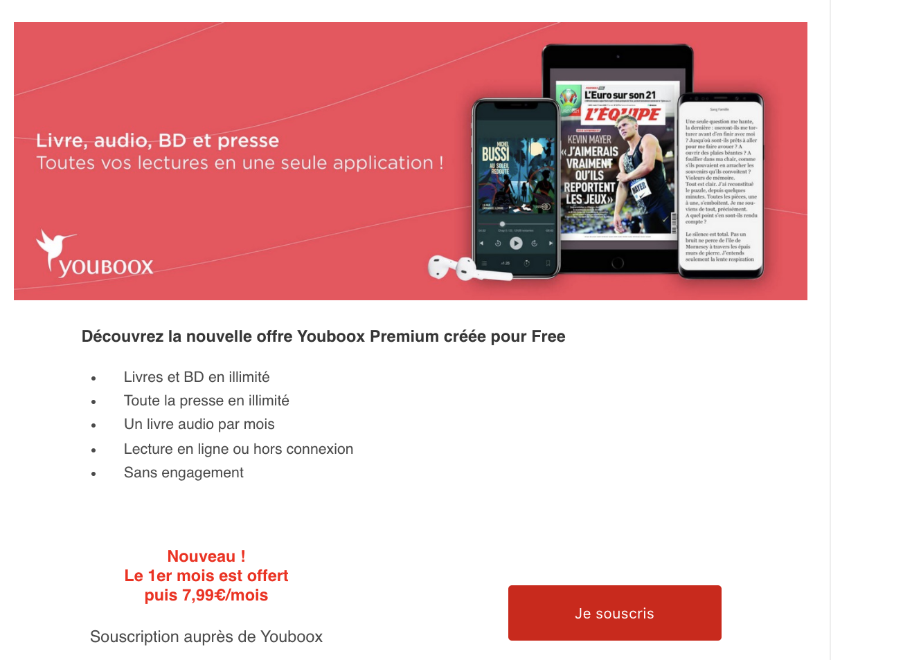 Le service compte plus de 2 millions d’abonnés. Actuellement, l’abonnement présenté comme une déclinaison de l’offre Youboox Premium standard, est offert pendant 1 mois par Free à ses abonnés avant de passer à 7,99€/mois, sans engagement. Un mail leur a été envoyé pour leur permettre de bénéficier de cette promo via une page dédiée.