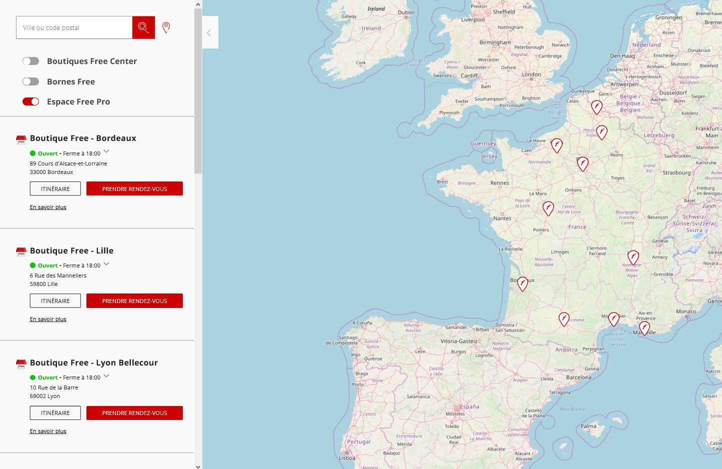 Où se rendre pour échanger avec les experts Free Pro ? Vous pouvez désormais retrouver les Free Center possédant un espace dédié à la nouvelle offre pour les entreprises. Rendez-vous simplement sur cette carte, puis cochez uniquement “Espace Free Pro”.