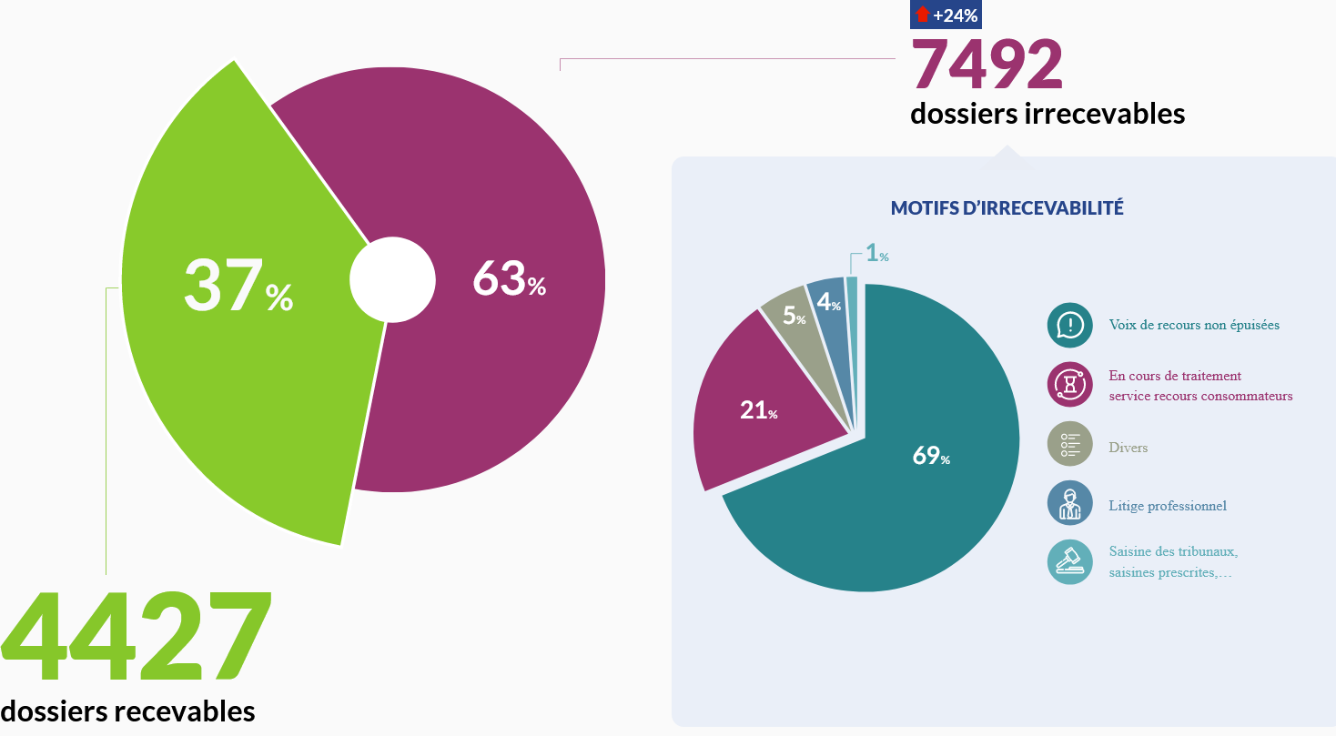 ” Le nombre de dossiers irrecevables s’inscrit en hausse (63% en 2020 vs 58% en 2019) principalement en raison du non-respect par les consommateurs des critères de saisine de la Médiatrice Ceci peut s’expliquer par une certaine impatience des consommateurs en lien avec la nécessité pour eux d’avoir des moyens de communication dans le cadre du confinement et du télétravail qui s’est généralisé en 2020 du fait de la COVID-19. ” explique la Médiatrice dans son rapport annuel.