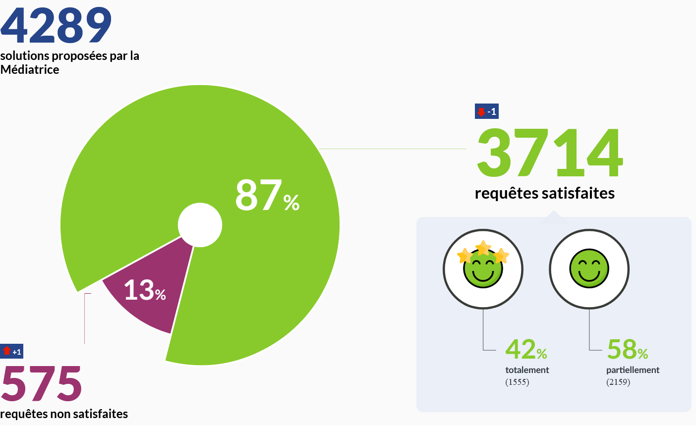 Techniquement, le nombre de dossiers traités est même plus bas qu’en 2019, puisque 4289 solutions ont été proposées par la Médiatricie en 2020, contre 4529 en 2019. 3714 de ces requêtes ont été satisfaites, au moins partiellement.