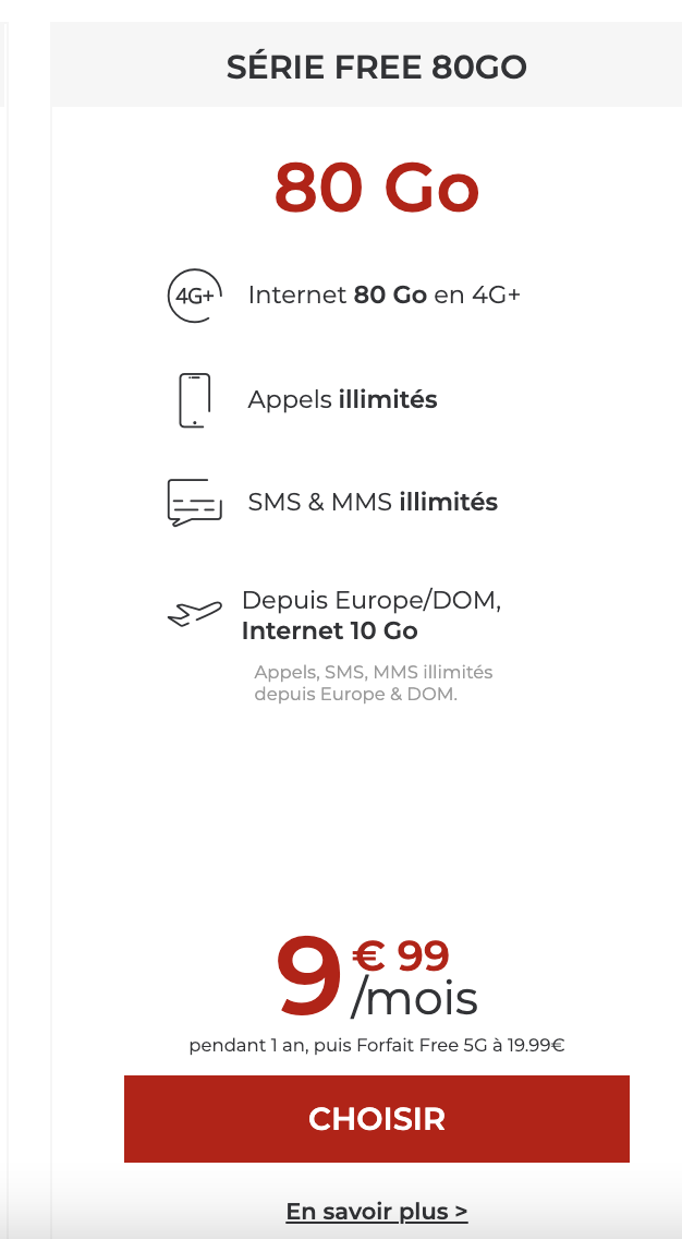 A titre de comparaison, Sosh, la marque d’Orange, tente de se démarquer avec deux offres limitées, 40 Go à 12,99€ et 80 Go à 15,99€. Red by SFR propose actuellement un forfait 80 Go à 13€, 100 Go à 15€/mois et 130 Go à 19€ mais devrait changer de formules dans la journée. Enfin, Bouygues Telecom affiche une offre 80 Go à 12,99€, 100 Go à 14,99 euros et 160 Go à 19,99€ par mois. A noter que les marques de l’opérateur au carré rouge et celui de Martin Bouygues ripostent à chacune des attaques en gigas de leur adversaire. La bataille fait rage entre les deux rivaux sur le terrain de la data.