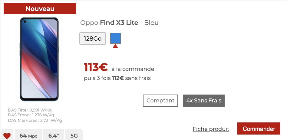 Le smartphone est proposé à 449€ au comptant, il est également possible de régler en 4 fois sans frais, moyennant une première commande de 113€, puis 3 fois 112€ sans frais. Pas de 24 fois sans frais pour le moment. La version proposée offre 128 Go de stockage, une compatibilité 5G, un coloris Bleu astral, une caméra principale de 64 Mpx, un écran Amoled de 6,4 pouces et une batterie de 4300 mAh.