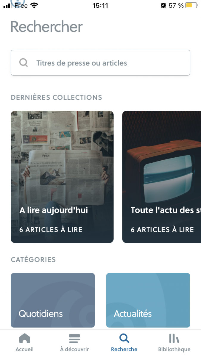 Cette section “Collections” est à retrouver dans l’espace “Recherche”, cliquez sur celle qui vous plaît et glisser de gauche à droite pour naviguer entre les articles ! Idéal pour retrouver plusieurs articles pertinents sur un fait d’actualité qui vous intéresse.