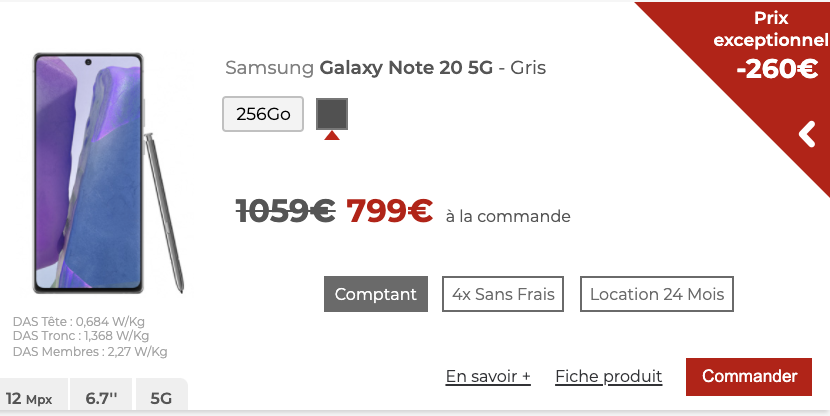 Ainsi le Samsung Note 20 5G bénéficie d’une grosse promo de 260€, son prix passe de 1059€ à 799€ en achat comptant. Ce modèle 256 Go est disponible en paiement 4 fois ou 24 sans frais.