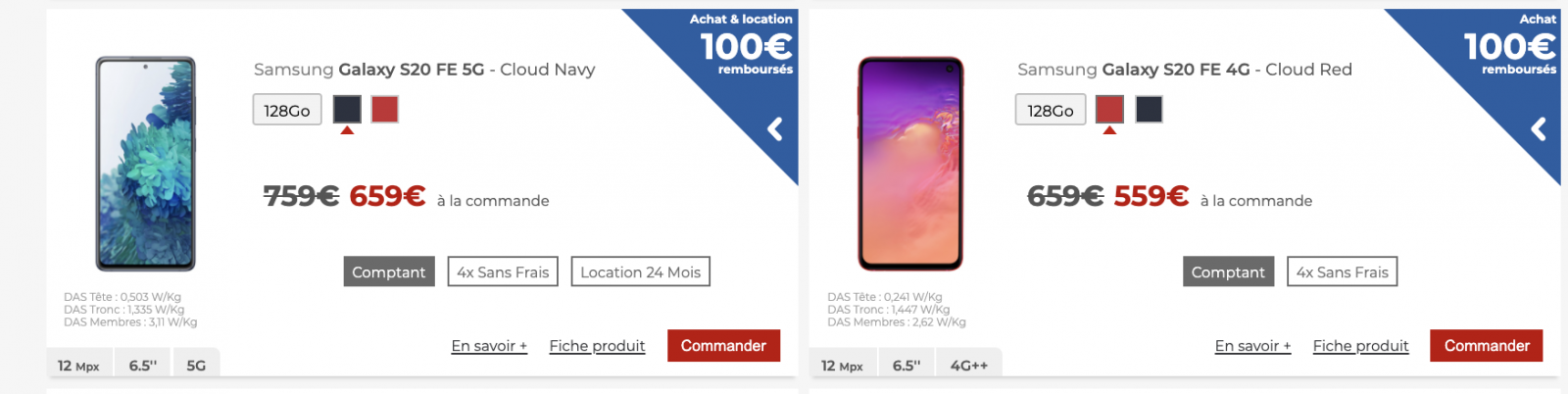 Dans le même temps, les Samsung S20 FE 5G et 4G profitent d’une réduction directe de 100€ et d’une ODR du même montant. Les deux promos cumulées, leur prix passe respectivement à 559€ et 449€.