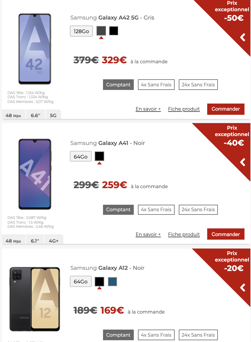 Enfin, le Samsung A42 5G voit son tarif en achat comptant tomber à 239€ soit une réduction de 50€. Le A41 est désormais proposé à 259€ au lieu de 299€. Et le A12 clôture la valse des promos avec une réduction de 20€ pour un prix s’élevant à 169€. Ces trois modèles sont également proposés en paiement en 4 fois et 24 fois sans frais.