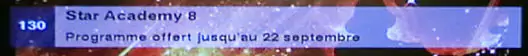 Le canal 130 de Freebox TV qui diffusera durant toute la saison le live de la StarAc 8 sera disponible gratuitement pour tous les abonnés Freebox jusqu’au 22 septembre comme l’annonce le bandeau d’information. Au delà, le tarif sera de 12€ pour toute la saison.