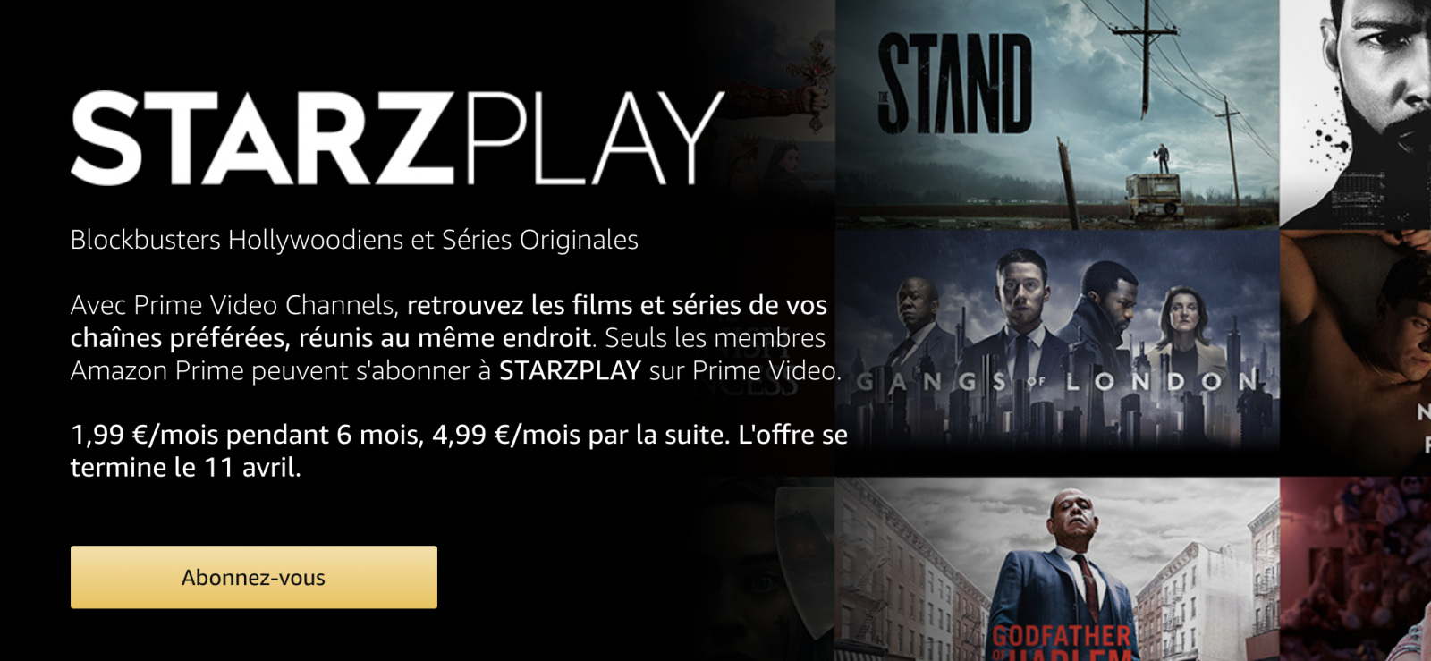 Le premier, Starzplay, est proposé à 1,99€/mois pendant 6 mois au lieu de 4,99€/mois. L’offre prend fin le 11 avril. Au total, cette plateforme propose 58 licences de séries (790 épisodes), 38 séries inédites et plus d’une centaine de films ainsi que de nouveaux titres chaque mois. Les abonnés Freebox Delta et Pop ayant activé Canal+ Séries offert pendant 12 mois par Free bénéficient déjà du catalogue de StarzPlay, désormais intégré à la plateforme de la filiale de Vivendi, sans surcoût.