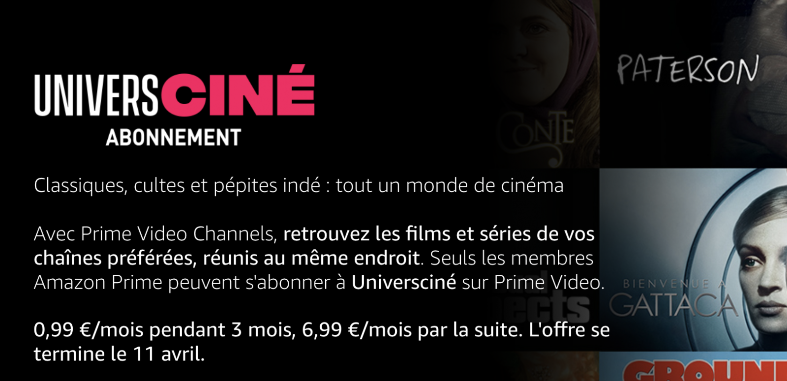 Déjà présent sur les Freebox dans sa version “vidéo à la demande”, pour acheter ou louer des films, UniversCiné a lancé sa plateforme avec abonnement en septembre 2020 donnant accès à plus 800 films, avec un catalogue renouvelé chaque semaine. La plateforme, spécialisée dans le cinéma d’auteur à travers le monde, est ainsi proposée sur Prime Video à 0,99€/mois pendant 3 mois au lieu de 6,99€.