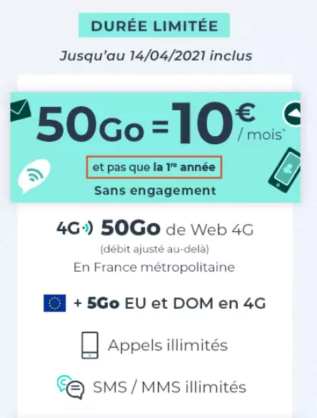 Jusqu’au 14 avril 2021, Cdiscount Mobile commercialise un forfait mobile sans engagement à 10 euros par mois. “Et pas que la 1ère année”, souligne par ailleurs la marque. Dans le détail, le forfait comprend les appels, SMS et MMS illimités. On dispose également d’une enveloppe data de 50 Go (débit ajusté au-delà) utilisable en 3G/4G pour la France et d’une enveloppe supplémentaire de 5 Go utilisable en 3G/4G pour le roaming en Europe et dans les DOM. Comme à l’accoutumée, la carte SIM triple découpe, payable à la commande, revient à 10 euros.