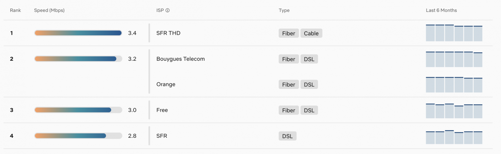Au classement, SFR THD conserve la première place un débit de 3,4 Mbits/s comme lors du mois précédent. A égalité en février, Bouygues Telecom arrive en seconde position avec un débit de 3,2 Mbits/s contre 3,4 Mbits/s précédemment. L’opérateur se retrouve désormais au même niveau qu’Orange, dont le débit moyen reste stable. Derrière, pas de changement, Free stagne à la troisième avec avec un débit inchangé de 3 Mbits/s. Toujours à la dernière place, SFR en xDSL fait du surplace avec 2,8 Mbits/s. Globalement, les écarts entre les opérateurs sont minimes.