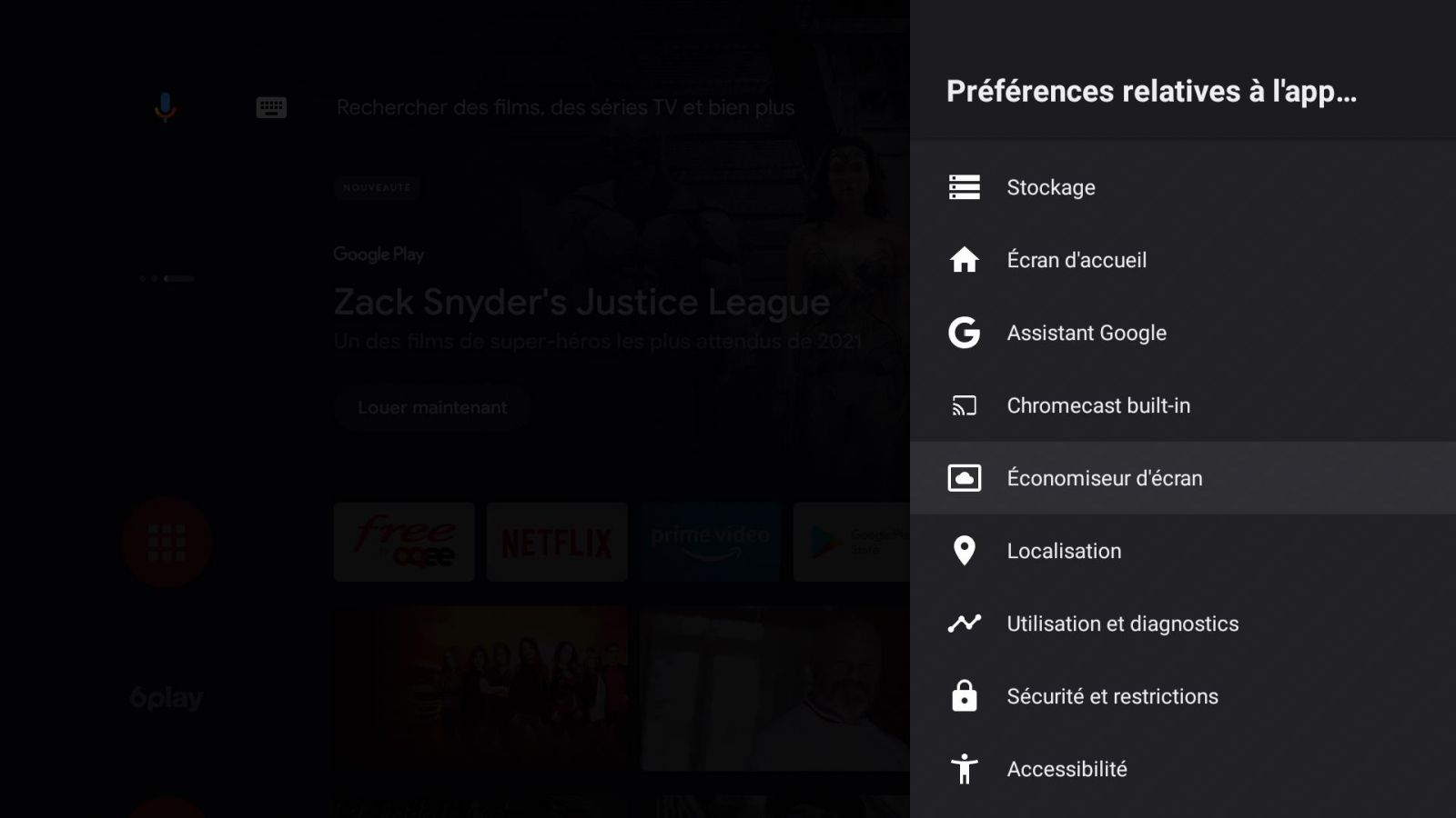 Une fois votre application choisie, il suffit de se rendre dans les paramètres de votre interface Android TV puis de cliquer sur “préférences relatives à l’appareil”. Optez ensuite pour l’option économiseur d’écran puis cliquez sur la première option.