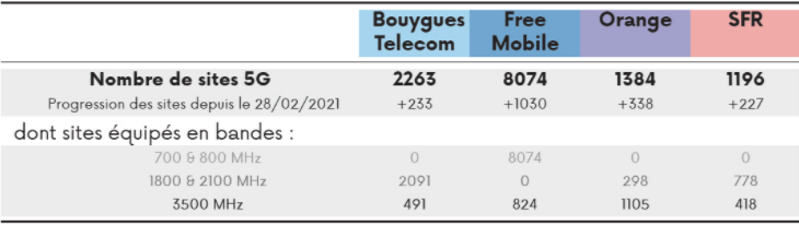 Sur la seule bande 3,5 GHz, Orange prend les devants avec 1105 sites activés, devant Free Mobile et 824 sites en service. Derrière, suit Bouygues Télécom avec 491 antennes et enfin SFR, avec 418 sites émettant sur la bande 3,5GHz.