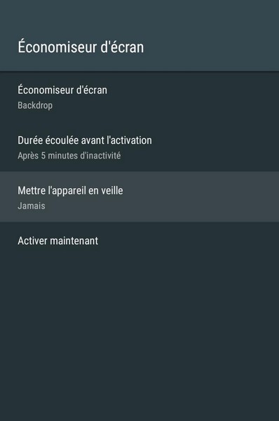 Pour paramétrer le temps d’inactivité avant mise en veille du boîtier TV, il suffit d’aller dans “Préférences relatives à l’appareil / Économiseur d’écran / Mettre l’appareil en veille”.