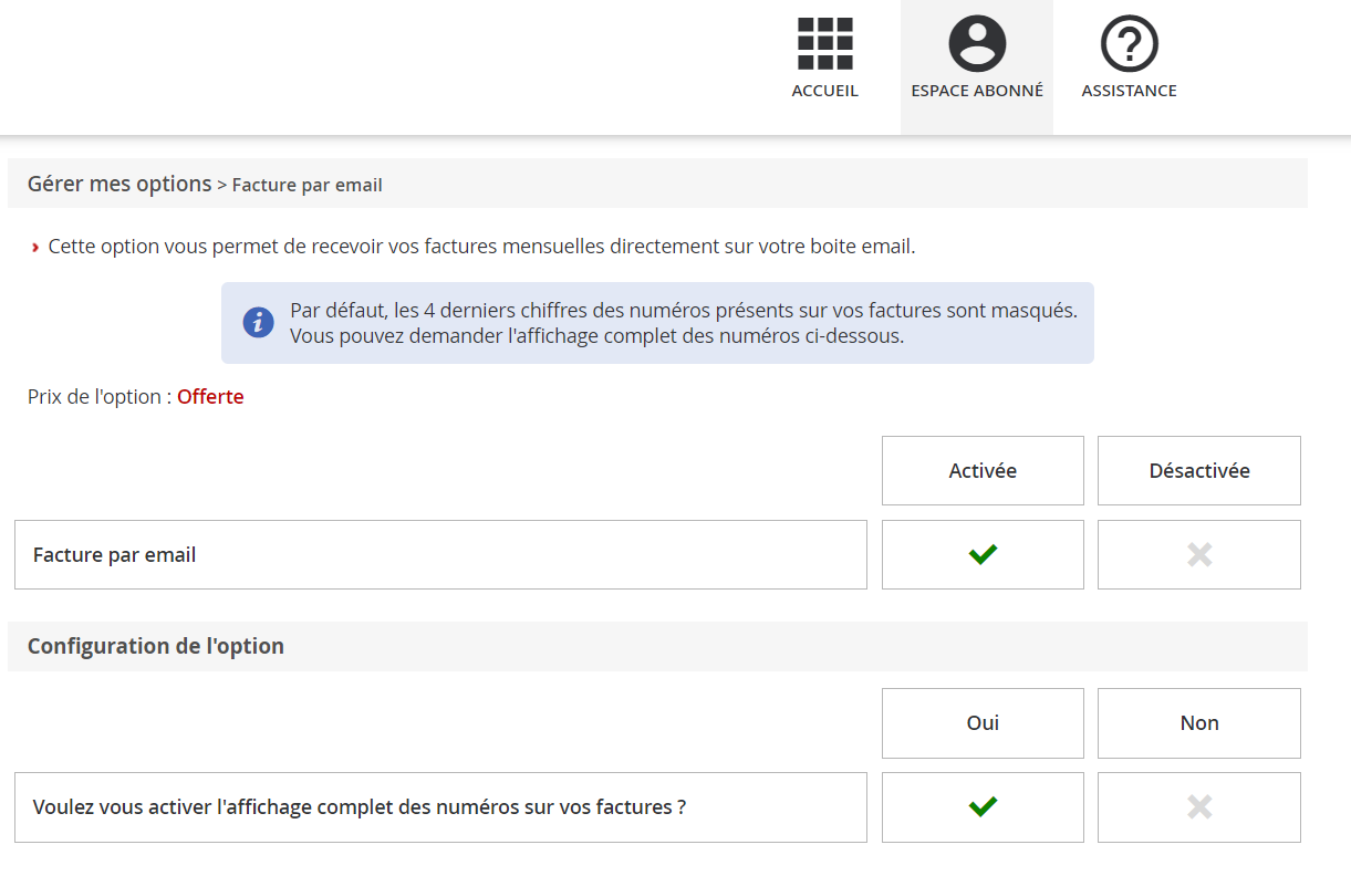 Pour ceux qui préfèreraient recevoir chaque mois ce format plus complet de facture, il faut aller dans “Mes options”, puis cliquer sur l’option “facture par email”.