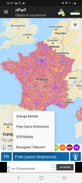 Disponible gratuitement sur Android et iOS, l’application mobile nPerf permet pour rappel d’évaluer la qualité de sa connexion 3G, 4G, 5G et Wi-Fi, en effectuant un test de débit descendant et montant, mais aussi un test de navigation sur plusieurs sites Internet et de streaming vidéo avec différentes qualités d’affichage. Un nombre de points est par la suite révélé lequel reflète la qualité globale de la connexion. Une carte de couverture et débits est également disponible avec un filtrage par opérateur (Orange, Free Mobile sans itinérance, SFR et Bouygues Telecom).