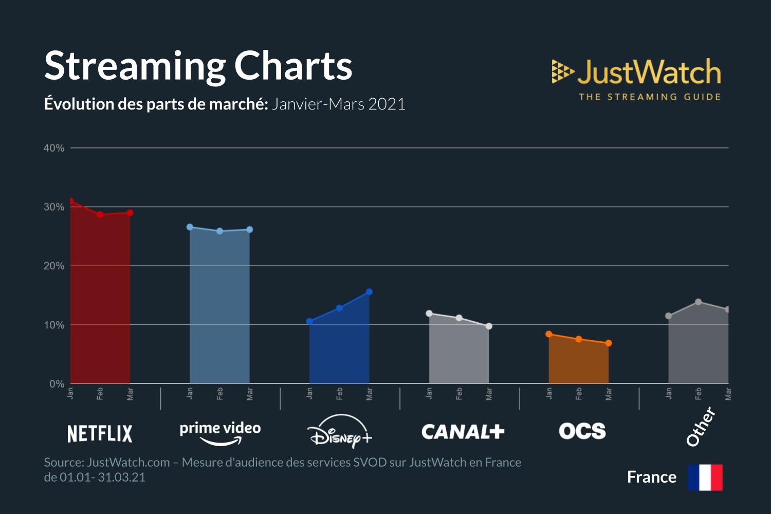 Ainsi, Disney+ est le seul à avoir continué de croître durant le premier trimestre, Lorsque Netflix, Amazon, Canal+ et OCS ont tous perdus des parts de marché en février.