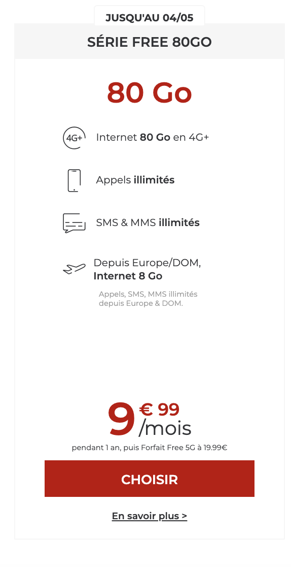 A l’heure où la bataille de la data bat son plein chez Red by SFR , B&You et Sosh, Free Mobile tend à viser au milieu, en proposant suffisamment de gigas pour un prix attractif. Jusqu’au 4 mai prochain, l’opérateur affiche ainsi son offre Série Free à 9,99€/mois pendant 1 an avec 80 Go de data en France métropolitaine et 8 Go en roaming. Au-delà de la première année, les abonnés basculeront automatiquement sur le nouveau Forfait Free 5G 150 Go à 19,99 euros par mois.