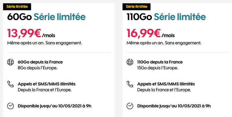 Sans engagement, ceux-ci comprennent les appels, SMS et MMS illimités depuis la France et l’Europe. Le forfait 60 Go prévoit une enveloppe de 8 Go pour l’Internet mobile en roaming depuis le reste de l’Europe. Dans le cas du forfait 110 Go, cette enveloppe passe à 15 Go.
