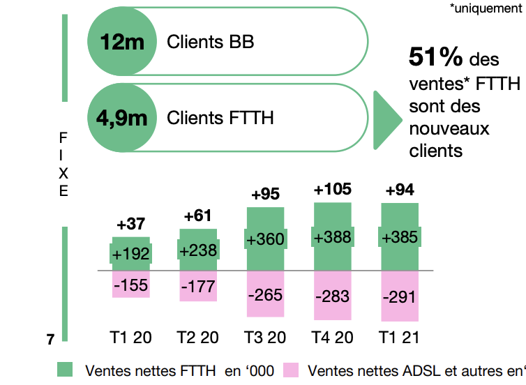 Une bonne dynamique commerciale, en particulier sur la fibre. Après un quatrième trimestre de haut vol, Orange commence bien l’année 2021. Entre le 31 décembre et le 31 mars, l’opérateur historique annonce ce matin lors de la présentation des résultats financiers du groupe, avoir recruté 385 000 clients sur la fibre, “un record pour un 1er trimestre et un niveau proche du record absolu de +388 000 ventes nettes au 4ème trimestre 2020”, se félicite t-il. Sur un an, le FAI enregistre près de 1,4 million de clients fibre supplémentaires, une progression de 38,9%. Autre motif de satisfaction, 51% de ses ventes FTTH sont de nouveaux clients, le reste provenant des migrations. Sur l’ADSL, Orange perd 291 000 abonnés de quoi lui permettre toutefois de performer sur le fixe, avec un gain de 94 000 abonnés sur la période, un autre record battu par l’opérateur sur un 1er trimestre.