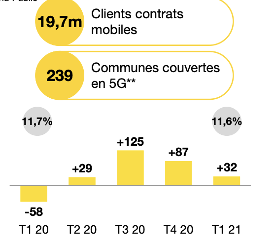 Autre facteur à prendre en compte, la crise sanitaire mais encore une fois l’opérateur s’en sort sans trop de dégâts. “Le 1er trimestre 2021 a continué d’être affecté par des mesures de restriction sanitaire, avec notamment la fermeture d’environ un tiers de nos boutiques représentant 40% de nos ventes. Malgré cette base comparable défavorable par rapport à un 1er trimestre 2020 encore peu impacté par la crise sanitaire, Orange France affiche une baisse très limitée de son chiffre d’affaires, qui aurait même été quasiment stable hors contre-effet des promotions sur les offres de lecture numérique.” Ses revenus s’élève à 4,404 milliards d’euros sur la période. Les chiffres d’affaires services Mobile et fixe sont tous deux en hausse, respectivement de 1 et 1,6%.