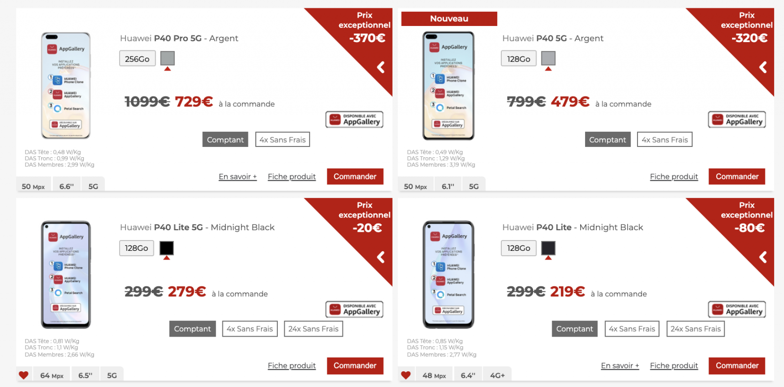 A noter que plusieurs modèles ont disparu de la boutique en ligne, comme le Huawei d’entrée de gamme Y6P, le Nova 5T et le P30 Pro.