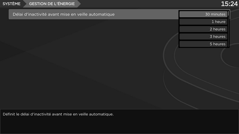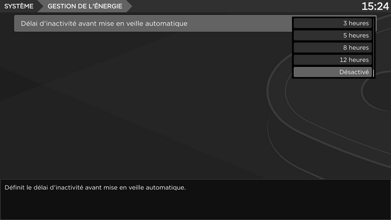 Un nouvel appui permet d’ouvrir un liste afin de définir le délai d’inactivité avant la mise en veille automatique du player. Différents délais sont prédéfinis : 30 minutes, 1 heure, 2 heures, 3 heures, 5 heures, 8 heures ou 12 heures.