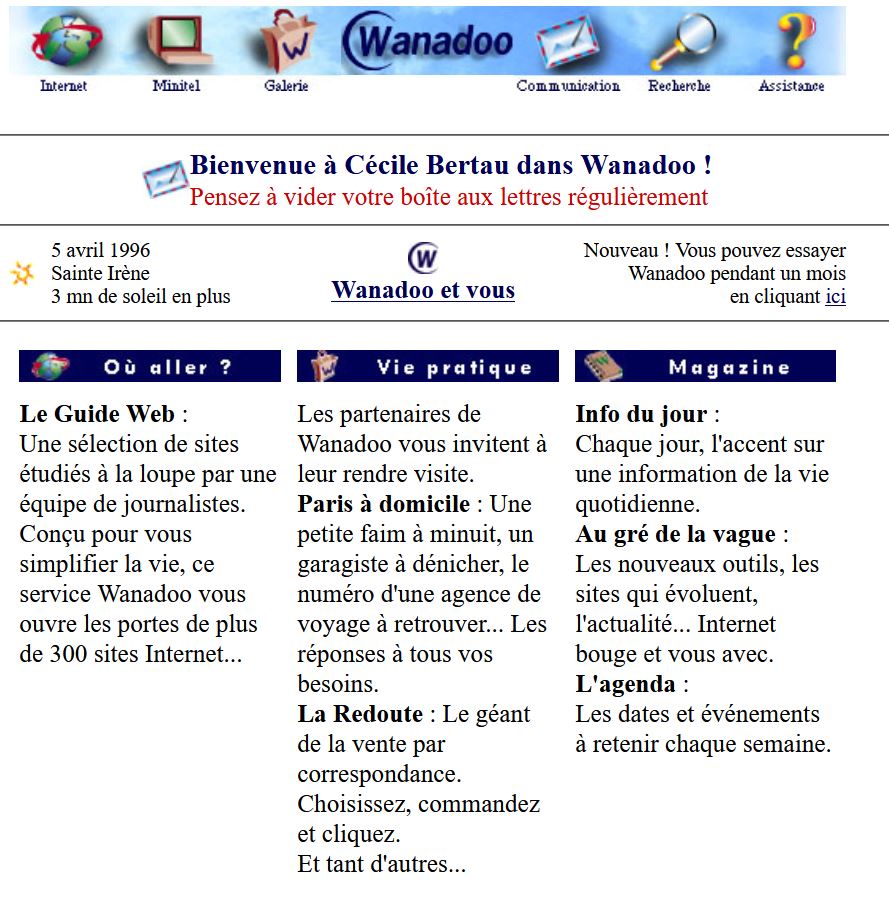 C’est le lendemain de la fête du travail que le fournisseur d’accès internet lancé par France Télécom reçoit son premier abonnement, en la personne de Serge Soudoplatoff, qui tenait à l’époque le blog Almatropie. Après le 2 mai 1996, les abonnés suivront petit à petit, pour atteindre le million 4 ans plus tard. On peut rattacher plusieurs innovations au FAI, notamment la création de l’un des tout premiers App store avec “Le bazar bleu”, mais aussi différents services proposés comme des webmails. Pensez-y la prochaine fois que vous verrez une adresse mail wanadoo.fr, c’est un peu d’histoire sous forme d’un courriel que vous aurez en fait reçu. 😉