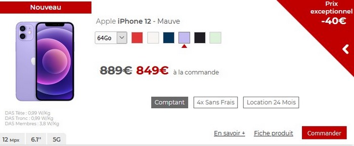 iPhone 12 64 Go (location) : 239 euros à la commande, puis 19 euros par mois pendant 24 mois