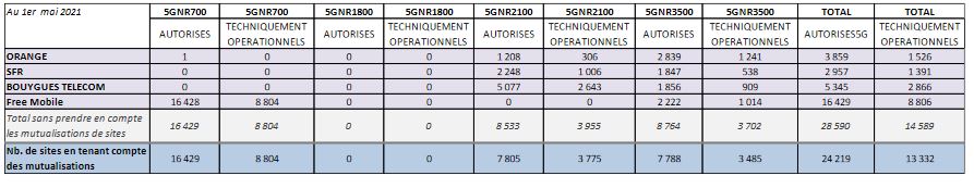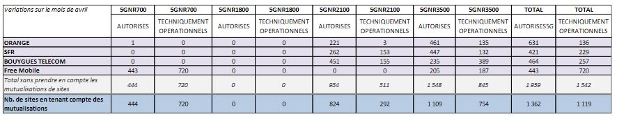 Sur le mois d’avril, les sites 5G autorisés ont donc augmenté de 6 %. Selon les déclarations des opérateurs, 55 % des sites autorisés sont techniquement opérationnels.